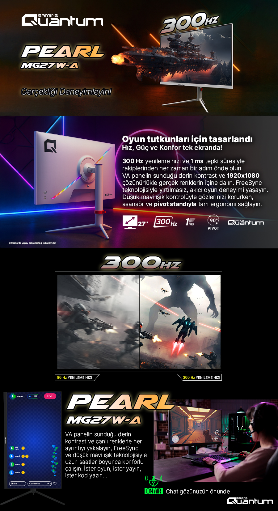 Ultra Yüksek 300 Hz Yenileme Hızı: Piyasada nadir bulunan bu hız, hareket bulanıklığını en aza indirir. FPS ve hızlı aksiyon oyunlarında rakiplerinizden her zaman bir adım önde olun.