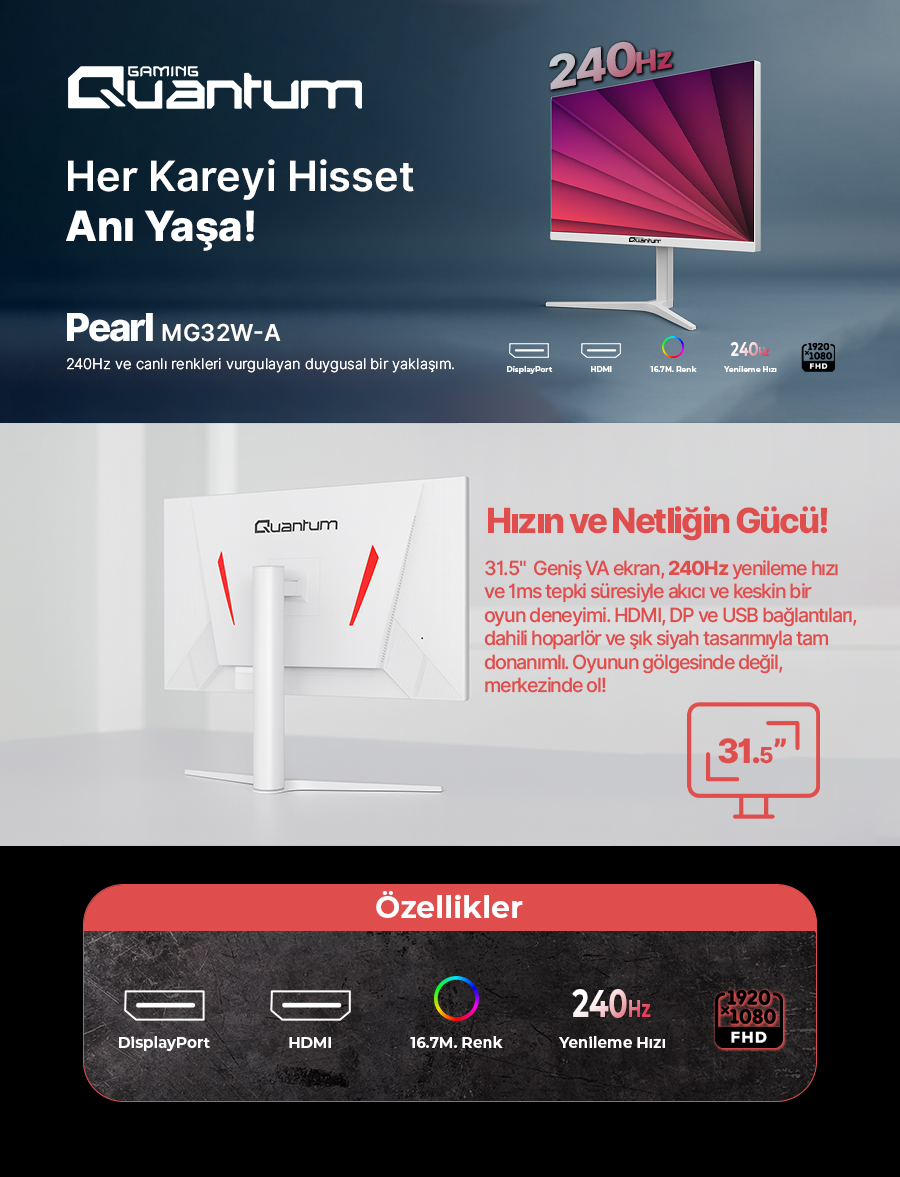 Quantum Pearl MG32W-A FHD VA 240Hz 1ms 2xHDMI+2xDP Dahili Hoparlör 31,5\" Flat Beyaz Yükseklik ayarli Gaming Monitör QNMNT10F080960