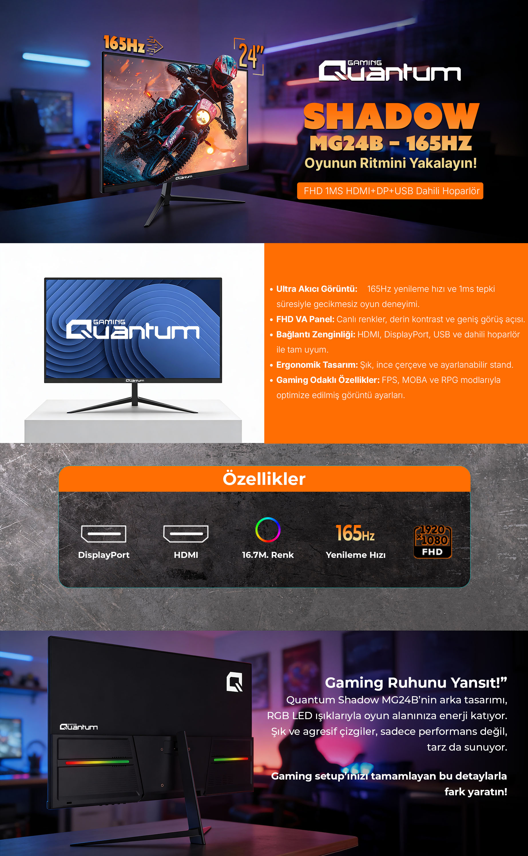 Quantum Shadow MG24B-165 FHD VA 165Hz 1ms HDMI+DP+USB Dahili Hoparlör 24" Flat Siyah Gaming Monitör QNMNT10F080013