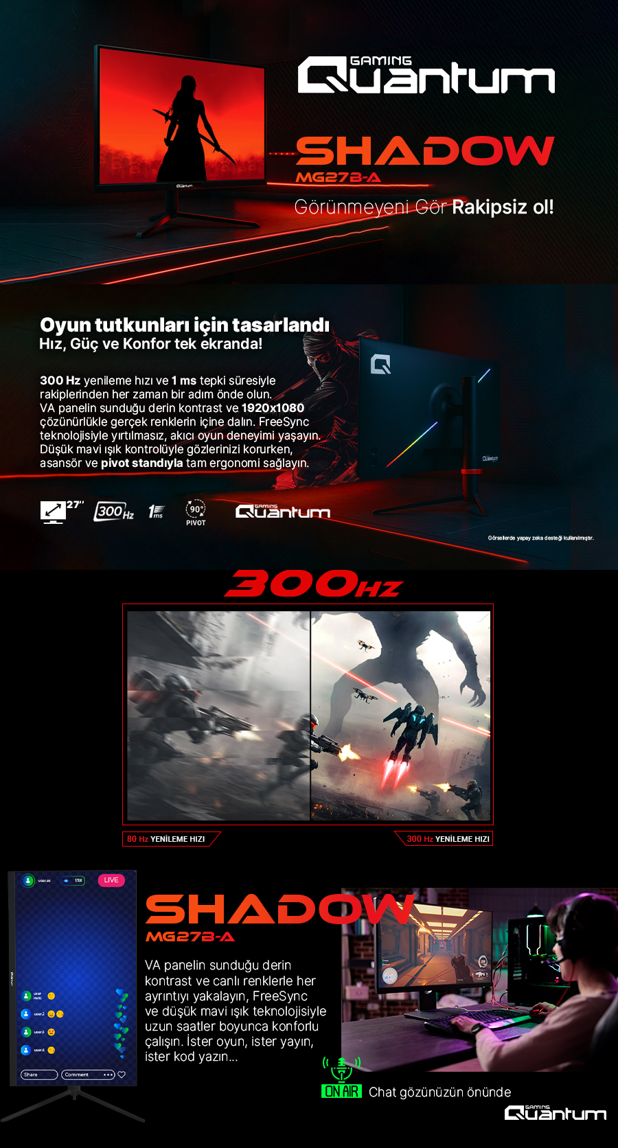 Quantum Shadow MG27B-A FHD VA 300Hz 1ms 2xHDMI+2xDP Dahili Hoparlör 27" Flat Siyah Yükseklik ayarlı