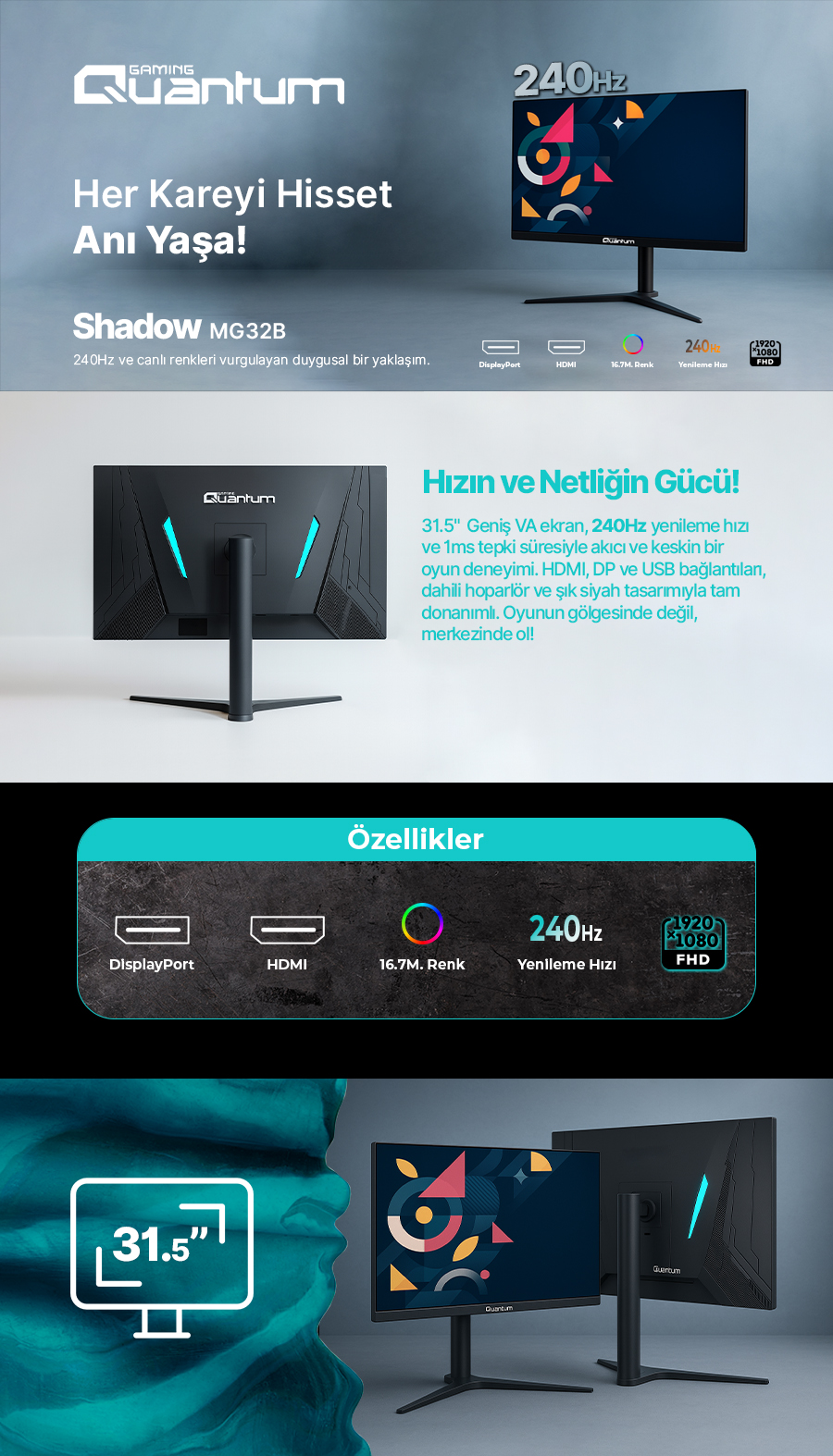 Geniş ekranın görkemi ve e-spor hızının gücünü birleştirin! Quantum Shadow MG32B-A, devasa 31.5 inç Full HD ekranı ile oyun alanınızı büyütürken, 240 Hz yenileme hızı ve anlık 1 ms tepki süresi ile size en akıcı ve rekabetçi deneyimi sunar. Şık siyah tasarımı ve yükseklik ayarlı standı, uzun oyun maratonlarında konforunuzu korur.